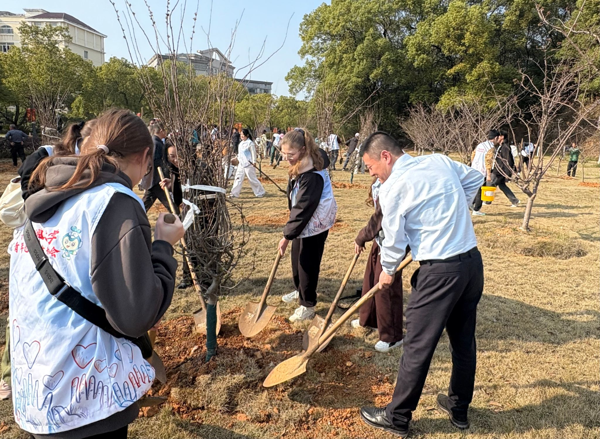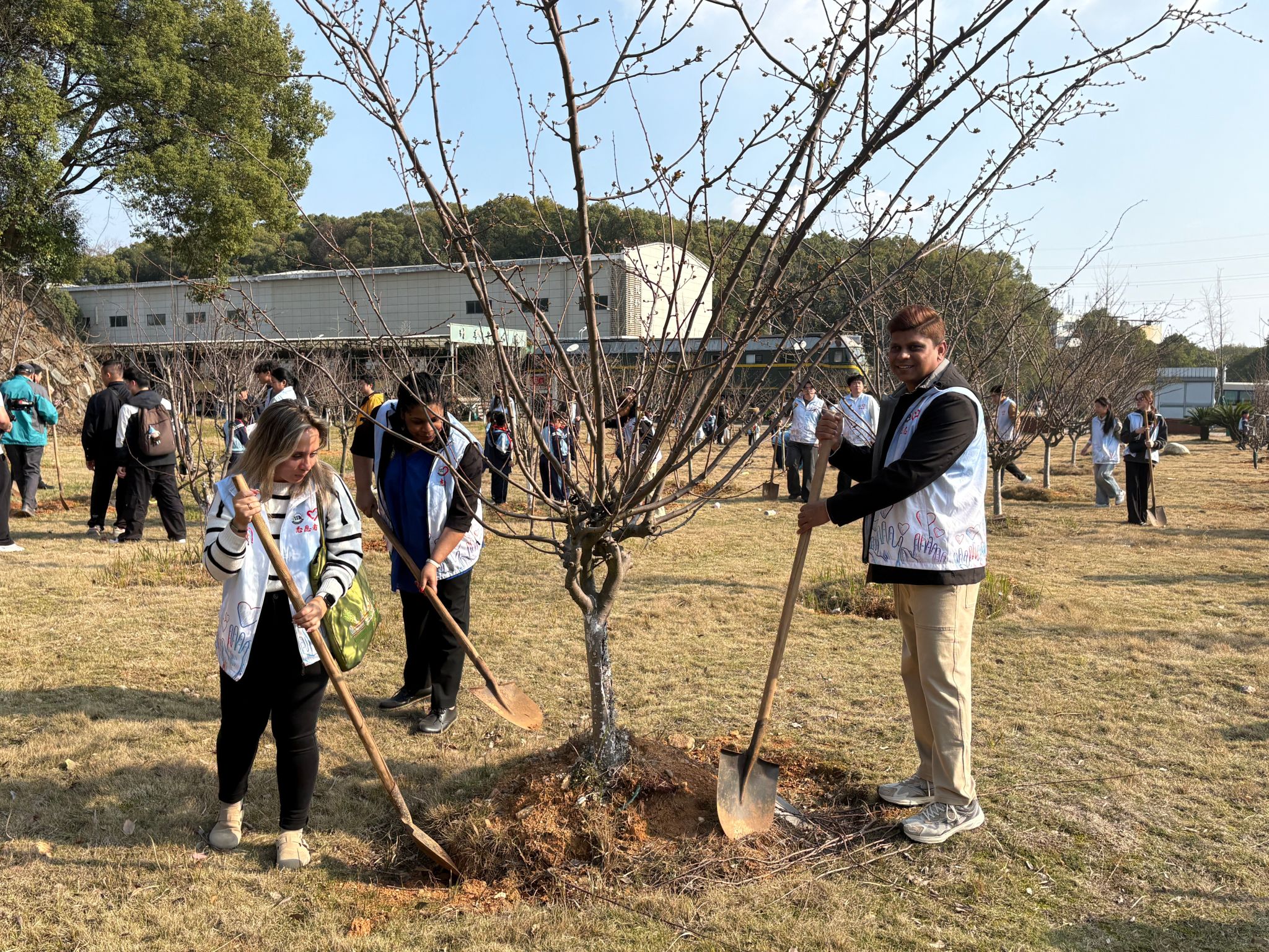 3月12日,春风催新绿,植树正当时。为践行生态文明理念,学校开展植树节主题活动,国交处组织外籍师生携手附属学校小学生共同参与。