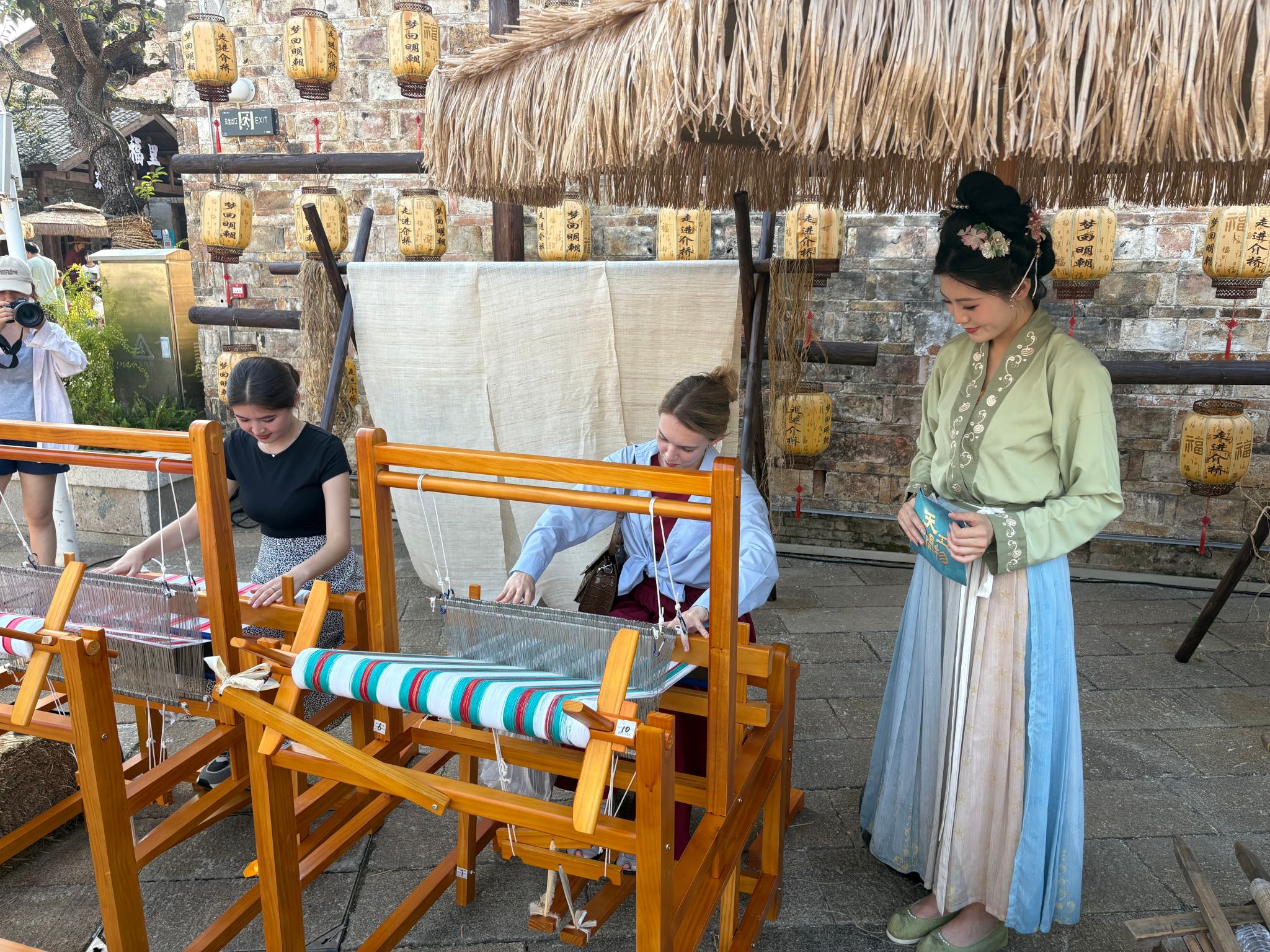 随后,留学生们前往介桥古村与螺蛳小镇,在古村内,留学生们围在古老的纺织机旁,尝试穿线、织布,亲身感受“经纬交织”的奇妙过程。而螺蛳小镇则以“螺蛳”为主题,将工业文化与旅游体验相结合,通过独特的景观设计和有趣的互动项目,让留学生们感受分宜现代文化与传统元素的巧妙融合。