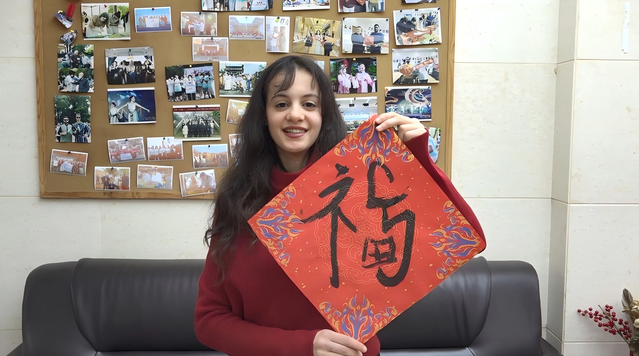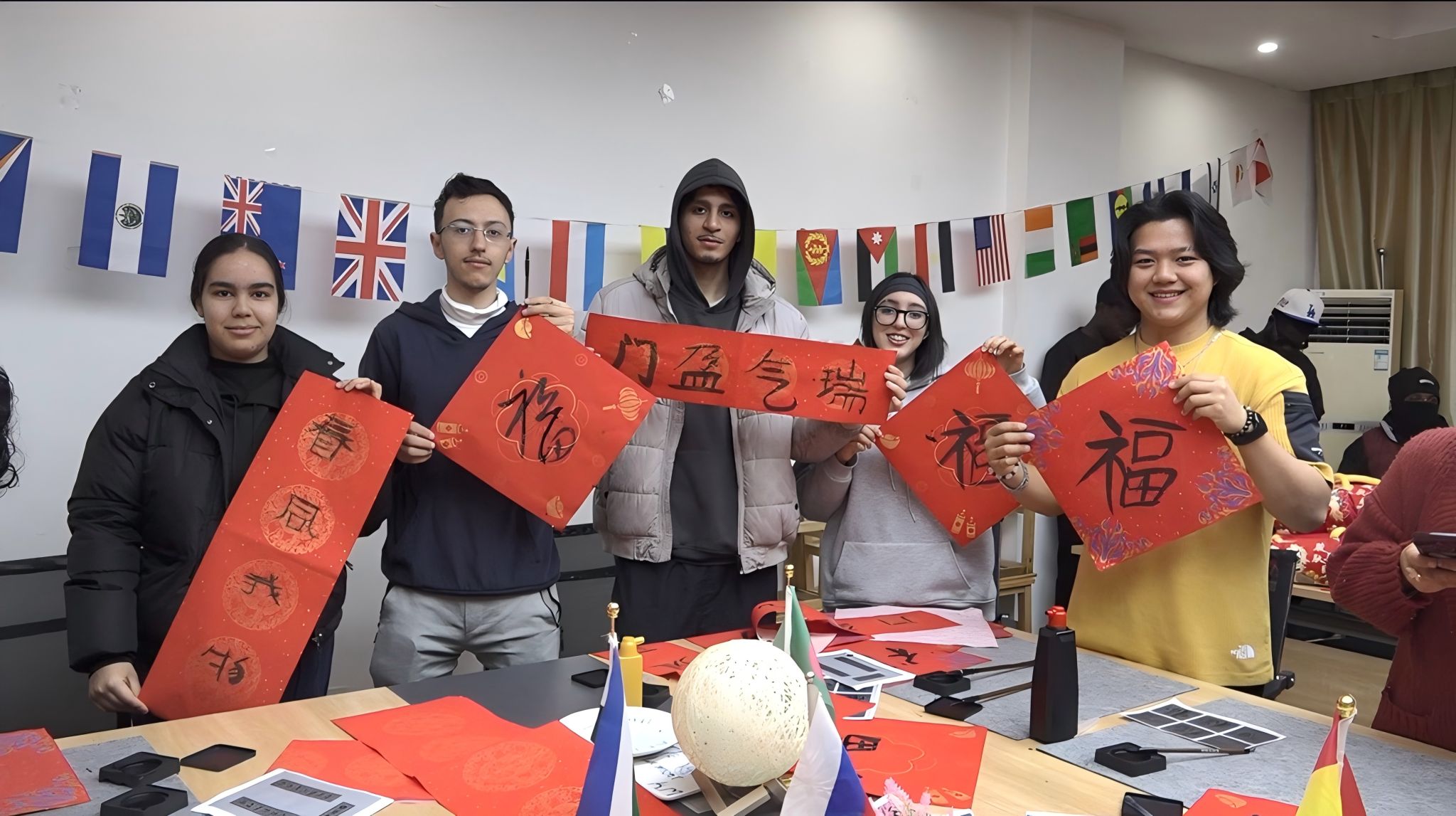 留学生们齐聚一堂,展示自己亲手书写的春联和“福”字,脸上洋溢着喜悦