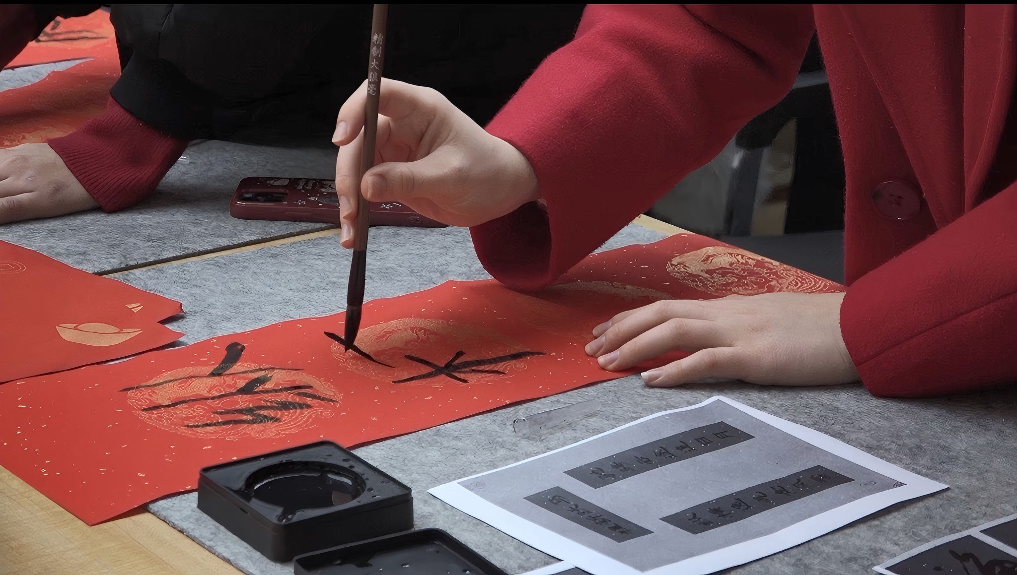 一名留学生专注地握着毛笔,一笔一画书写对联